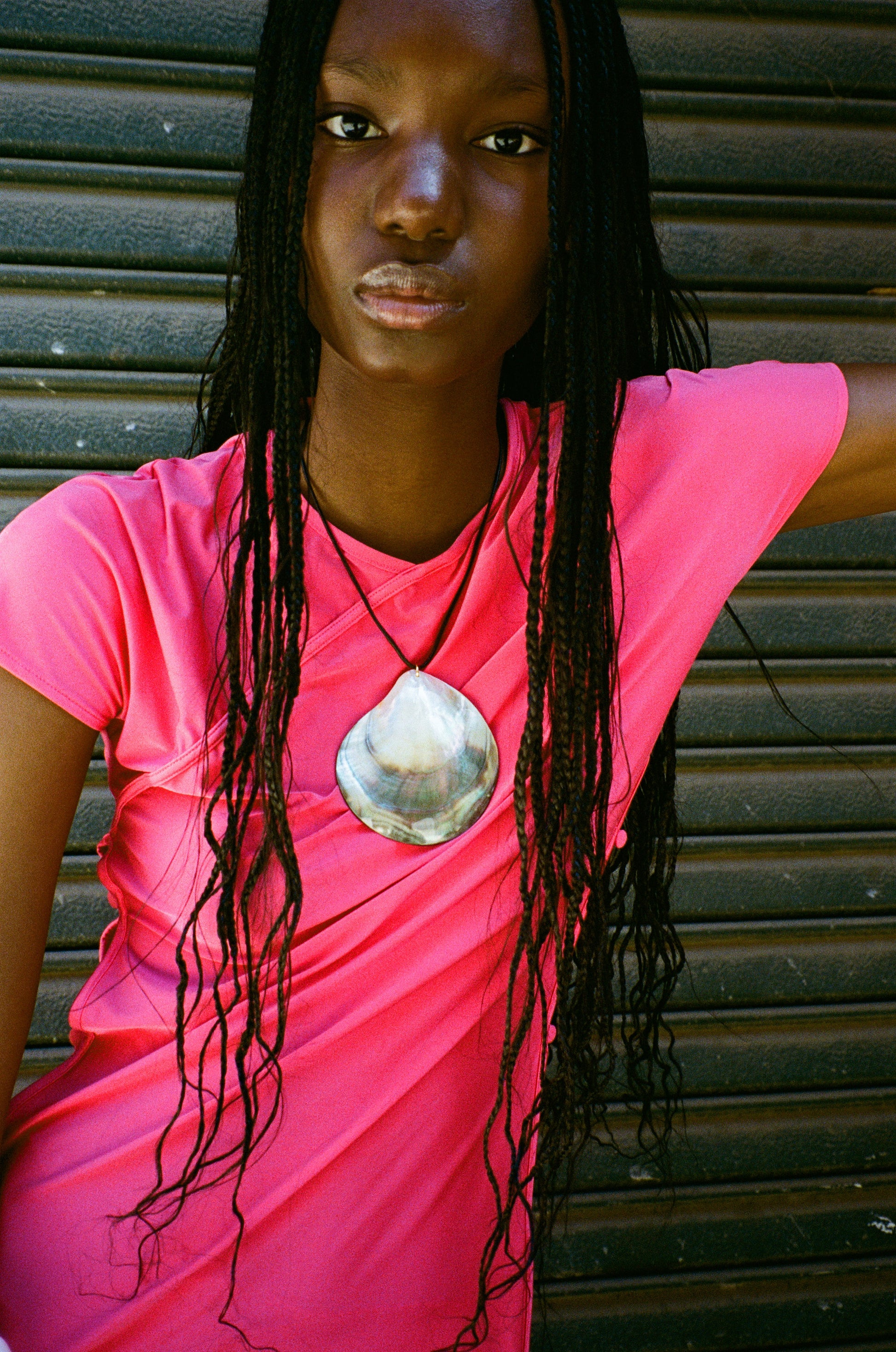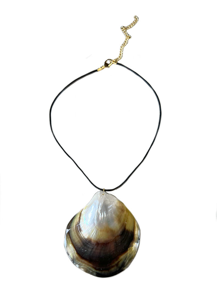 large Clam shell, LEATHER CORD, 18K GOLD CLASP AND CHAIN