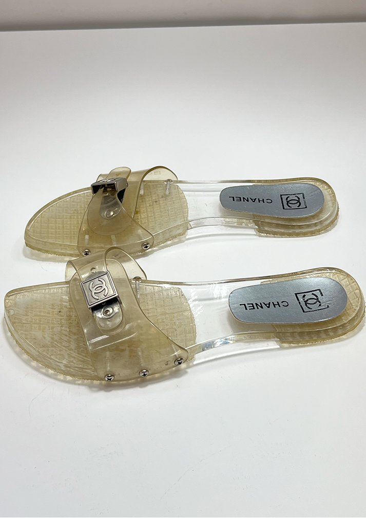 CHANEL VINTAGE JELLY SLIDE SANDALS.