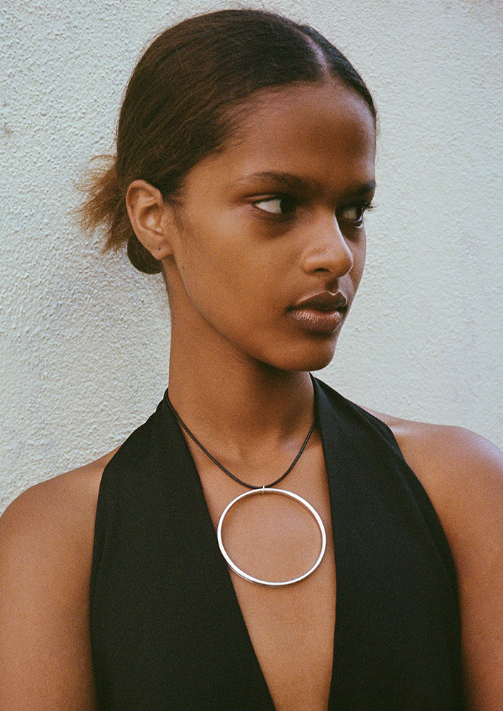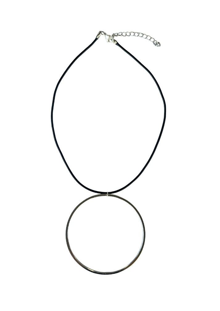 MINIMAL YET BOLD SILVER CIRCLE PENDANT ON A BLACK LEATHER CORD, WITH STAINLESS STEEL CLASP AND ADJUSTABLE CHAIN.