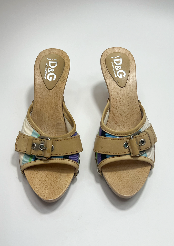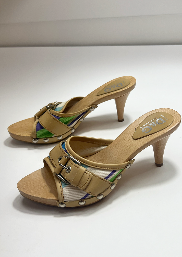 WORN CONDITION, SCUFFS AT FRONT OF WOODEN HEEL. SOME SMALL WATER STAINS ON LEATHER, OVERALL GOOD CONDITION.