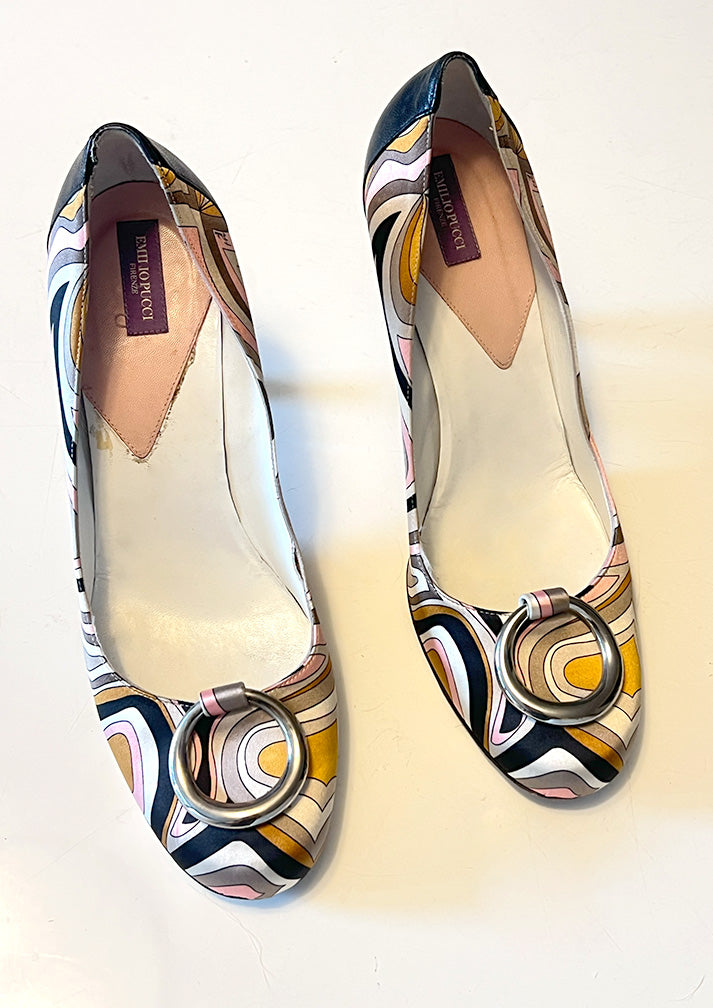 VINTAGE EMILIO PUCCI SATIN SILK HEELS.