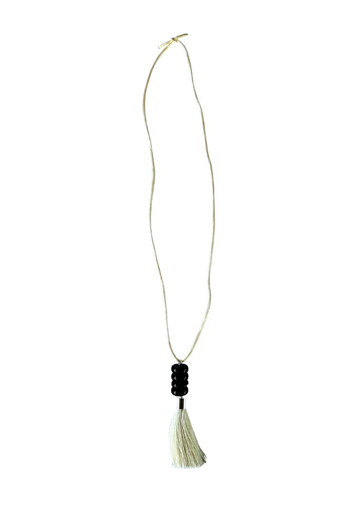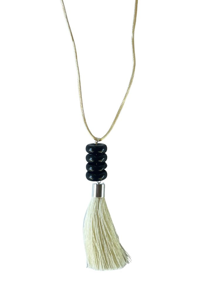 LONG AN ADJUSTABLE TO YOUR LIKING, IVORY SILK CORD, IVORY FABRIC TASSEL, WITH VINTAGE BLACK GLASS BEADS
