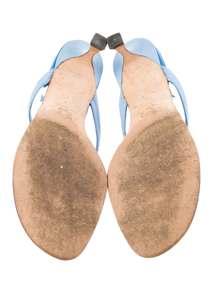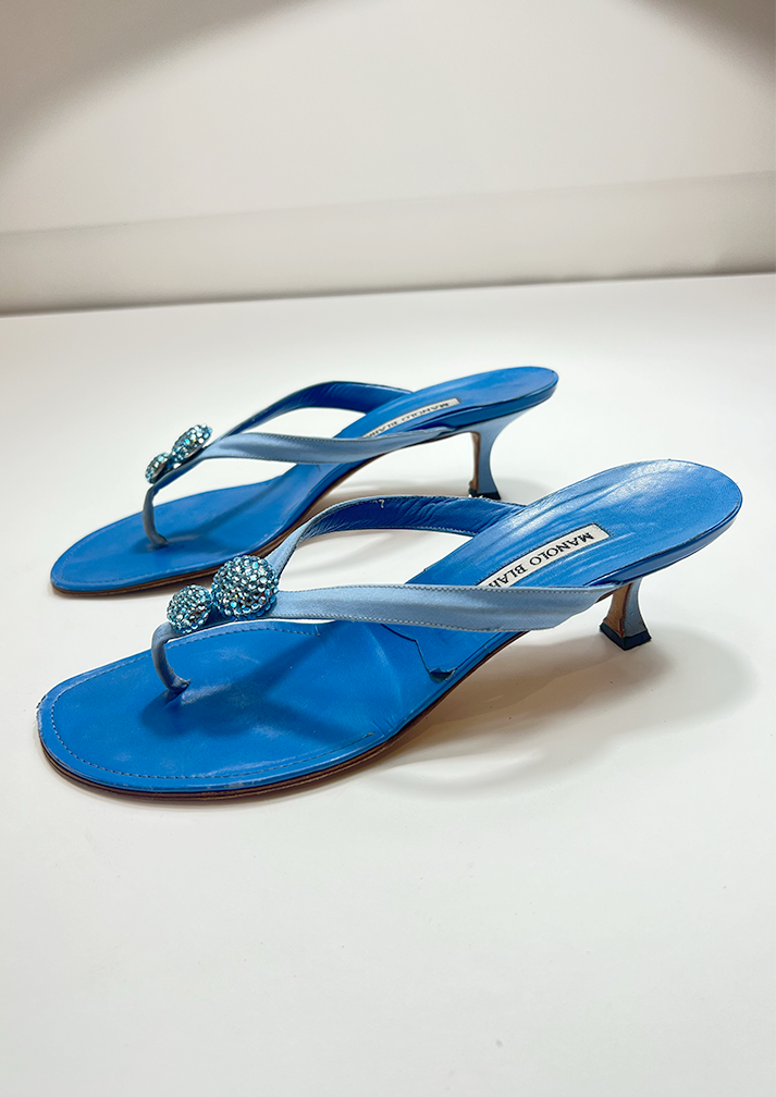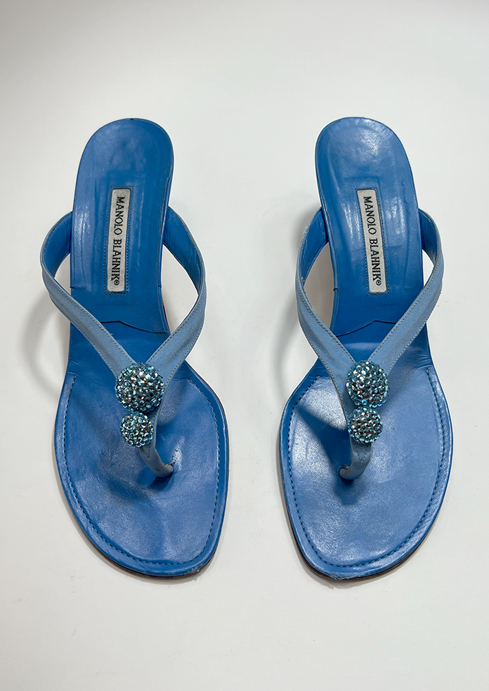 ICONIC MANOLO BLAHNIK BLUE CRYSTAL EMBELLLISHED VINTAGE FLIP FLOP HEELS.