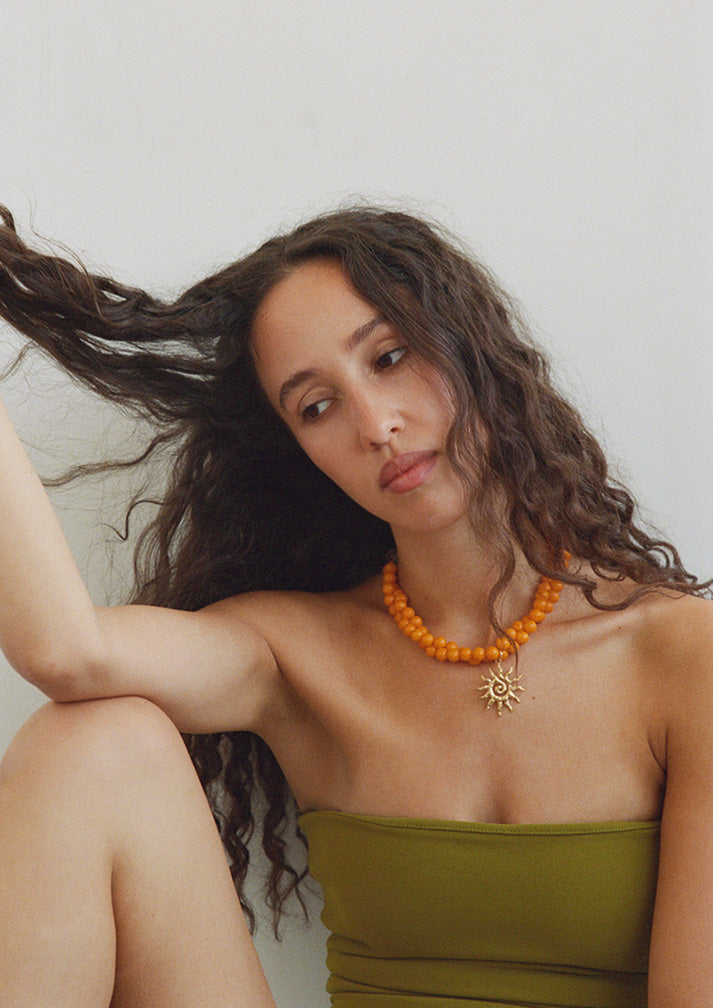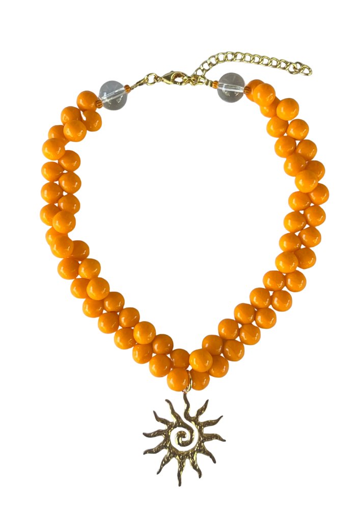 vintage glass orange beads, 14k gold metal sun pendant, 14k gold clasp and adjustable chain.